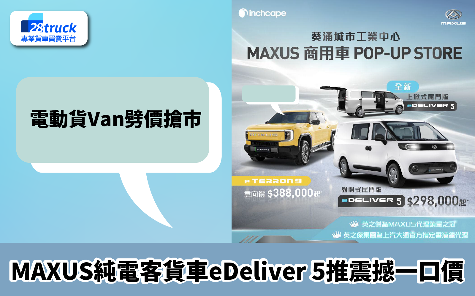 隨著本港商業用車市場電動化趨勢愈演愈烈,各大車廠競爭亦進入白熱化階段。英國品牌MAXUS近日出招搶佔市場,宣佈正式於葵涌工業區心臟地帶設立首個商用車POP-UP STORE,主打旗下純電客貨車eDeliver 5及純電四驅Pick Up eTerron 9,更推出震撼優惠價吸納中小企老闆及運輸業界,其中陳列車款劈至$26.8萬有找,擺明車馬要在電動「搵食車」市場分一杯羹。